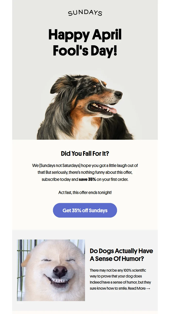 This example by Sundays is perfect. The subject line is "Sundays is not Saturdays For Dogs": simple, works on aplay of words, hurts no one, and it leads to a 35% promo code.