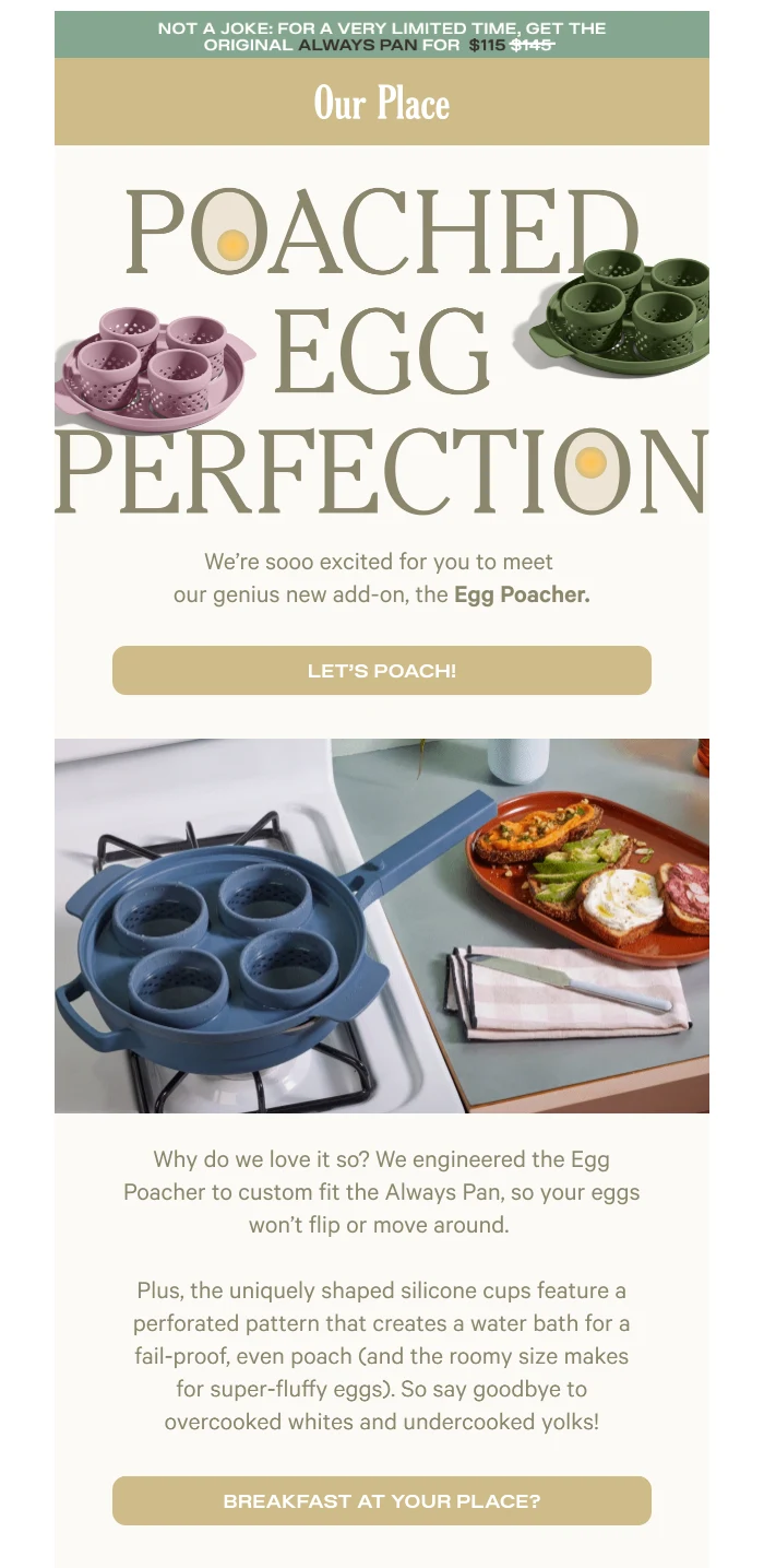 Here's a classic (and this fake product can help with timing too): a fake product to poach eggs, by Our Place.