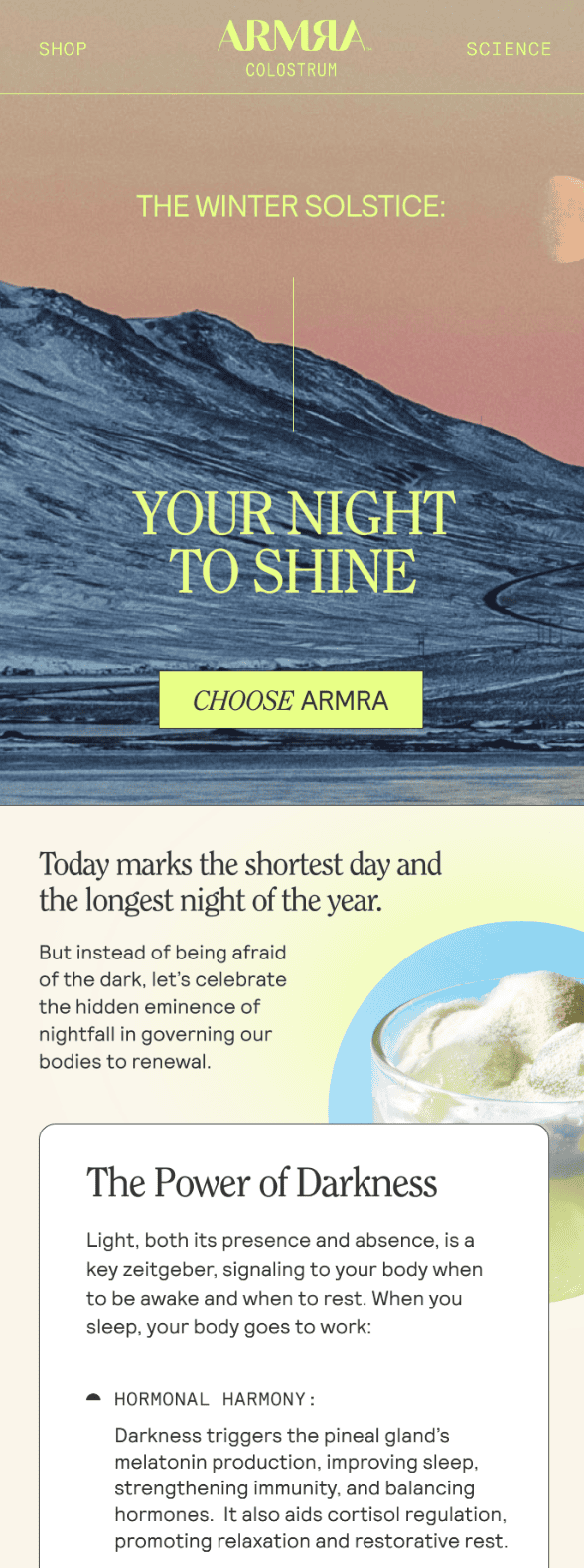A winter solstice campaign is a great way to stand out from typical Christmas messaging. Brands can use themes of restoration, contemplation, and coziness, which works well for wellness, self-care, and home brands.