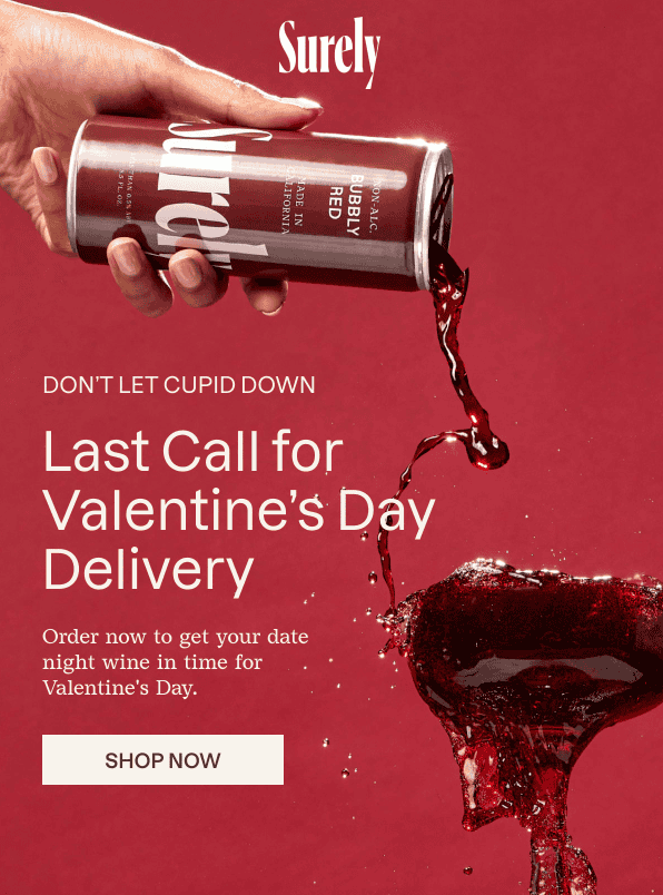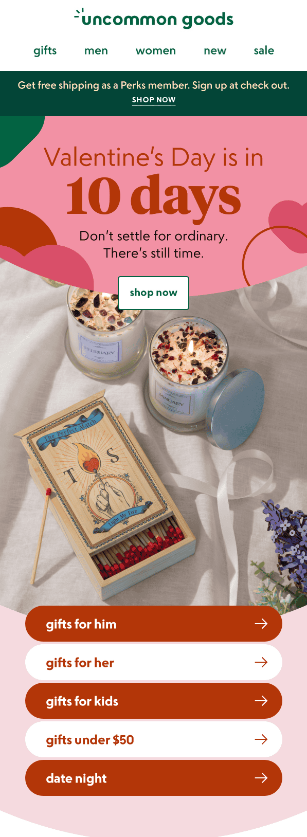 To pull this off, you need to recognize that a Valentine’s Day newsletter is a multi-week affair. You are marketing to distinct audience segments: early shoppers, procrastinators, and the last-minute buyers.