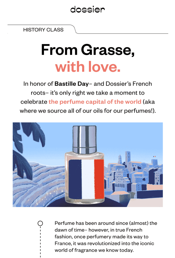 In this email from Dossier, the perfume brand explains the history of perfumery and its roots in Grasse, France, which is considered the perfume capital of the world.