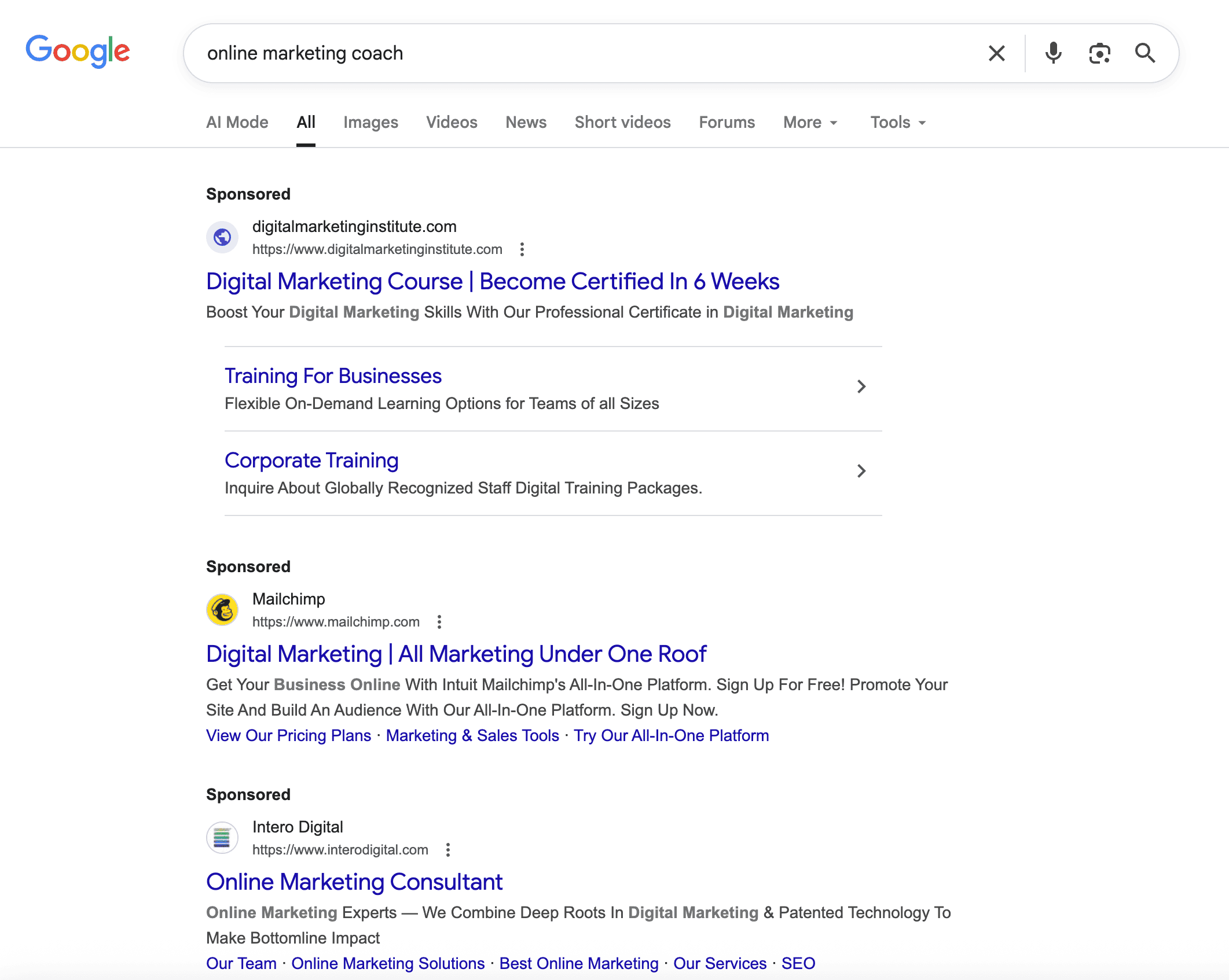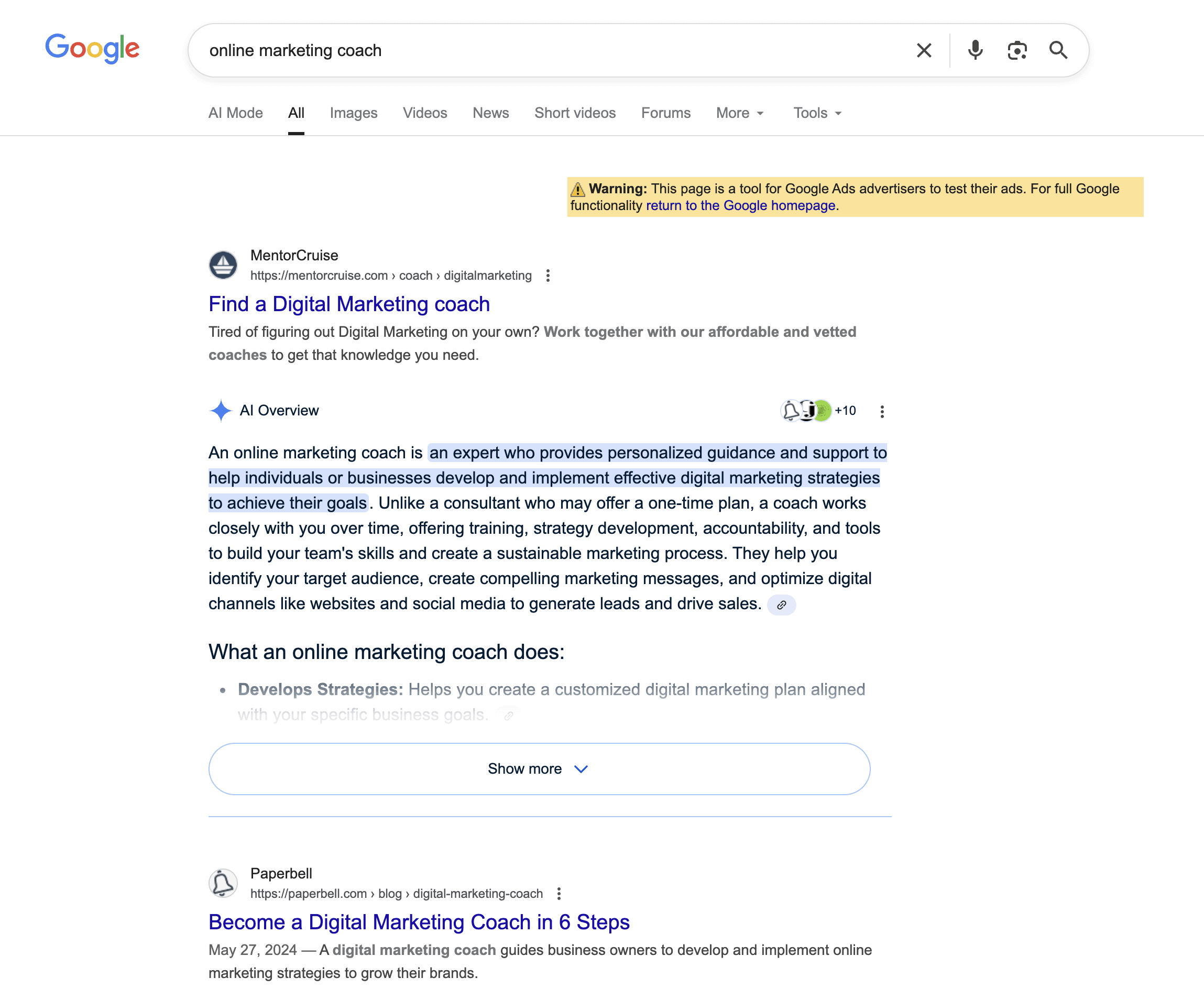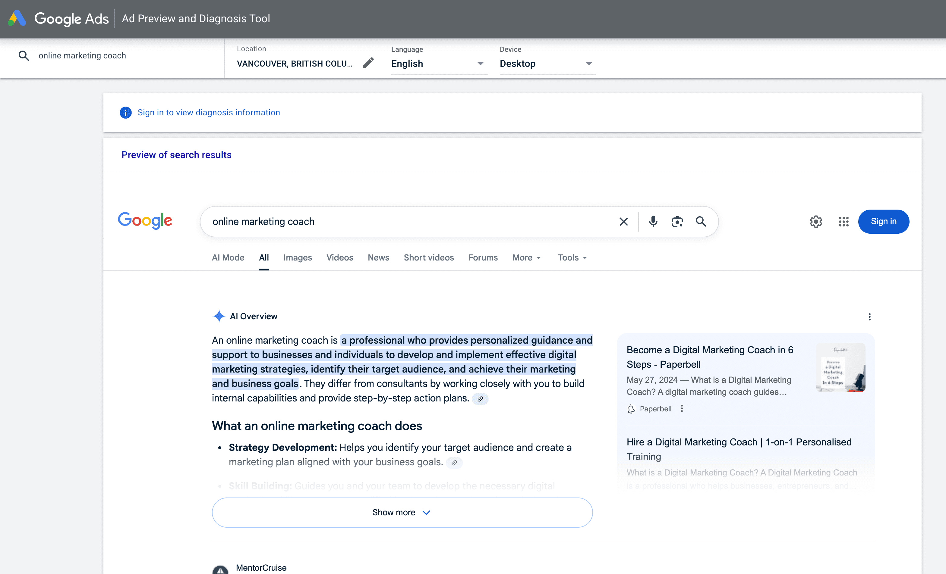 I didn’t see any Google ads advertising online marketing coaching. I also notice that Google Ads Preview still notes what country I’m conducting the search from.