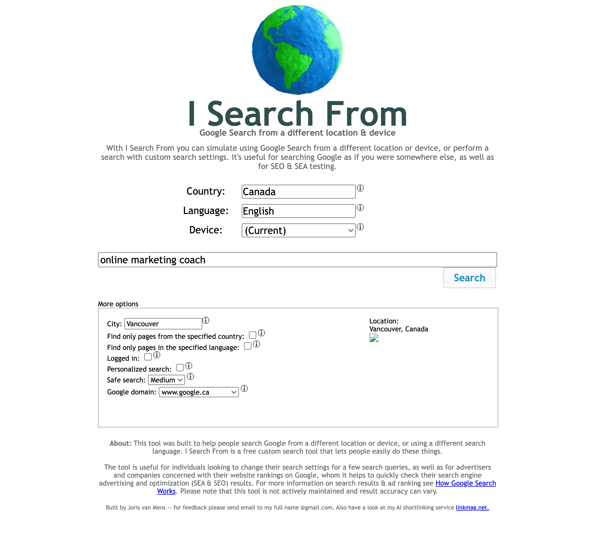 Let’s take the search term “online marketing coach” as an example. I’ll set my location to Vancouver, Canada. Here are the results.
