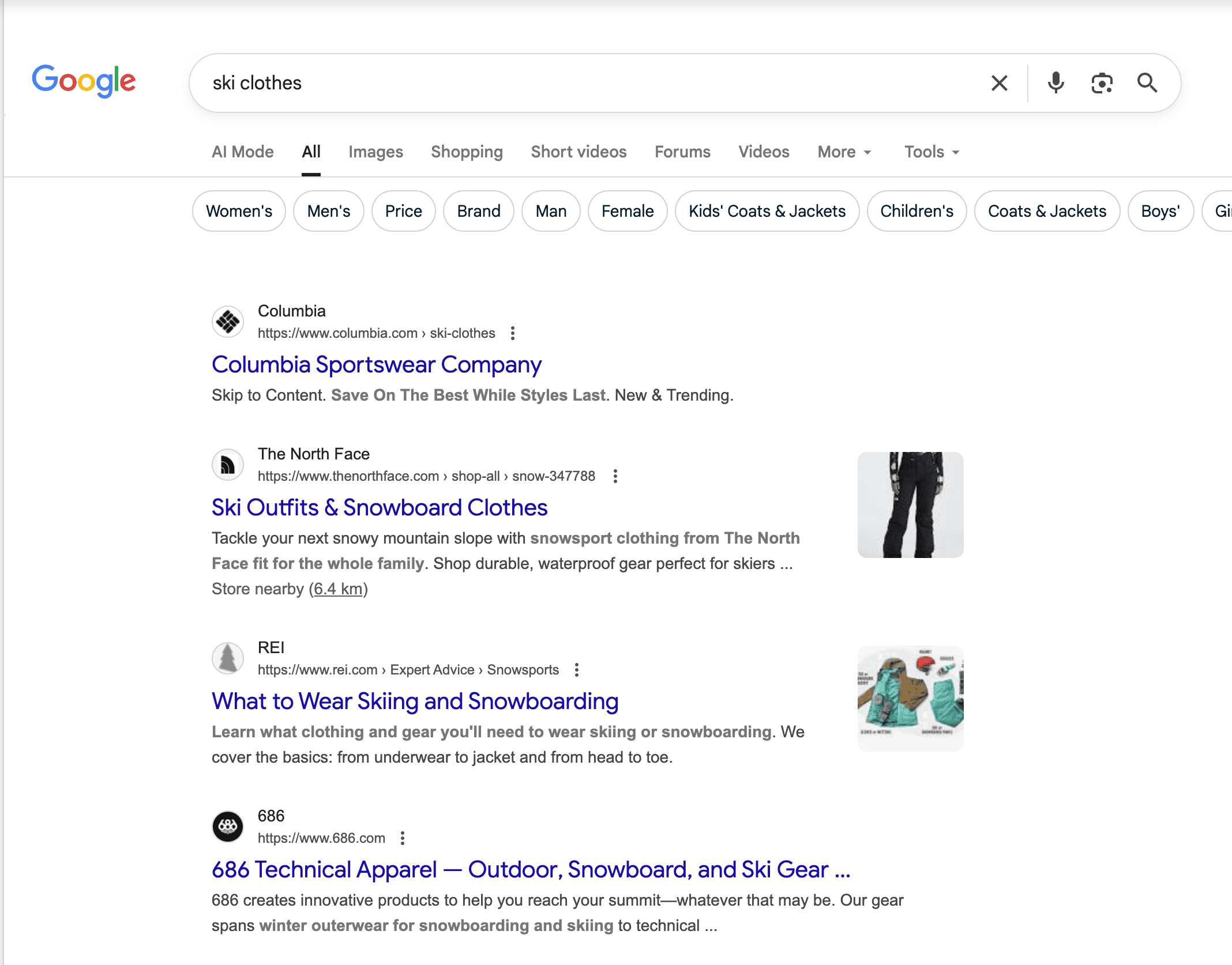 There’s a shopping section in the results page with links to different clothing websites, making it easy for me to check competitors’ ads on another platform like Google Ads Transparency Center.