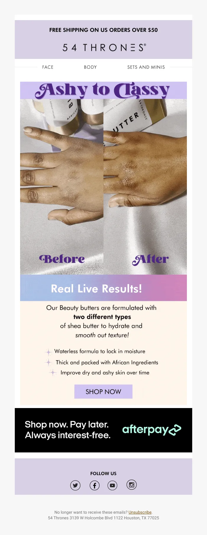 Show the real effects of your products by showing a before/after. Of course, you can repeat this email several times.