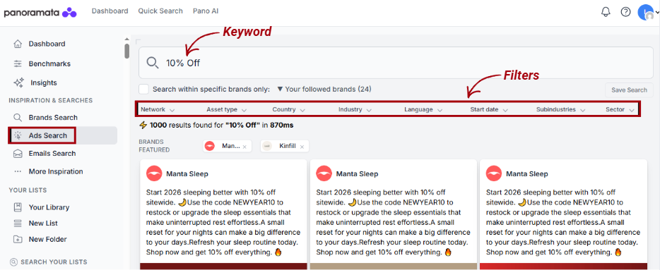 For more inspiration from a specific competitor, you can use the Brand Search option in the left-hand menu.