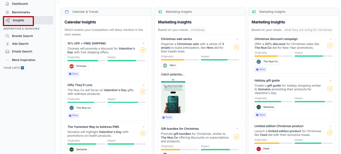 The Insights section gives you personalized marketing recommendations based on the brands you follow or any group/benchmark you created.