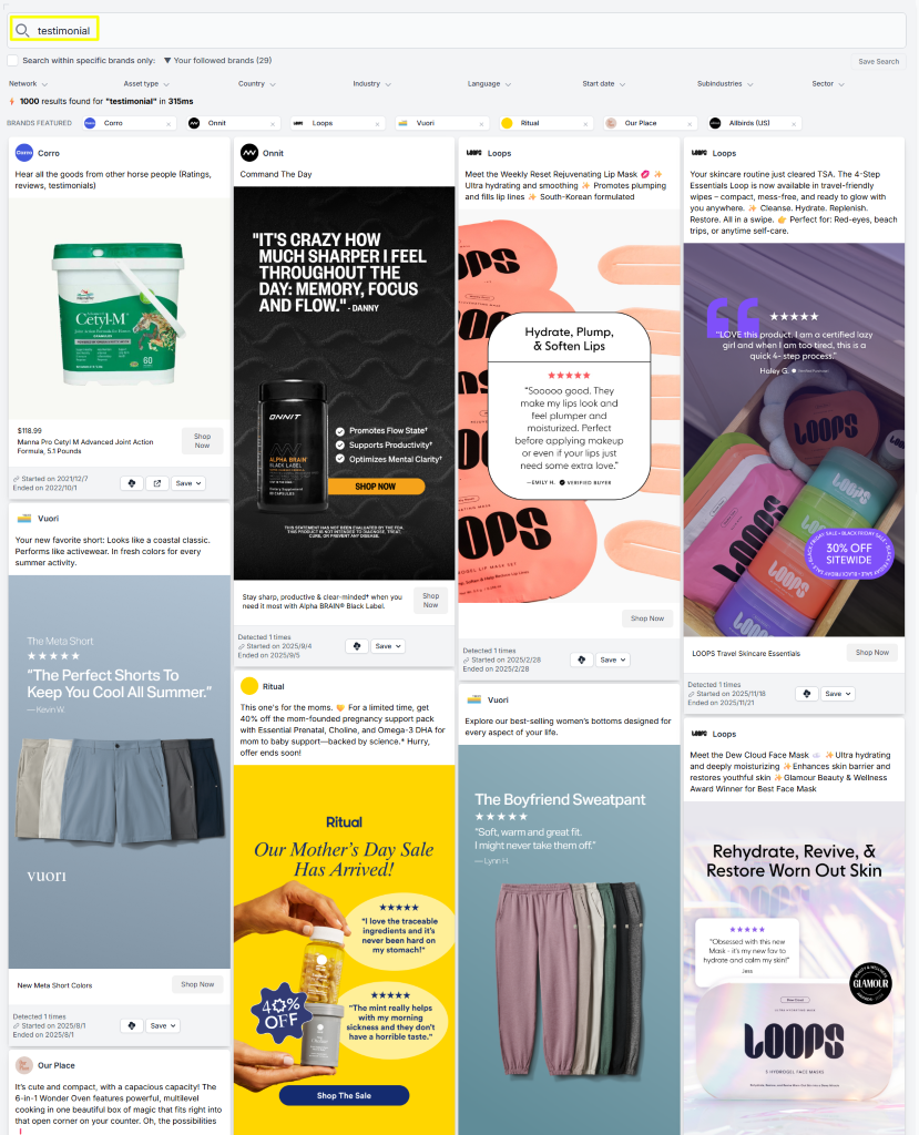 Try searching by creative style or specific themes. Here's an example where the keyword "testimonial" is entered, giving all the ads that feature customer testimonials.