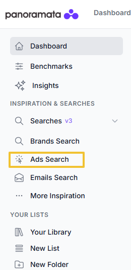 To start your inspiration search, click the Ads Search button located in the left-side menu of your main dashboard.