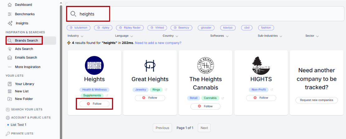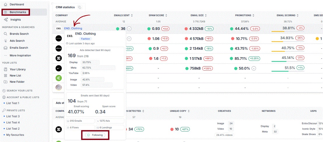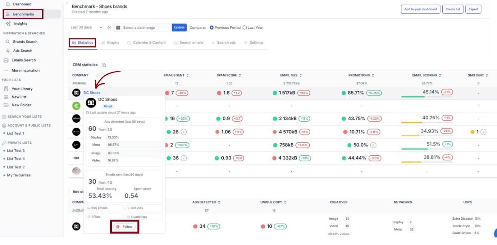 On the benchmark page (Settings tab) or its dashboard on the home page, hover over a brand name. A window will appear, where you can follow the brand (the Follow button is located at the bottom of the window).