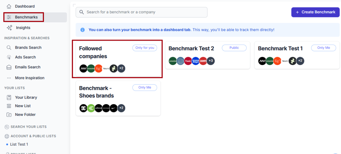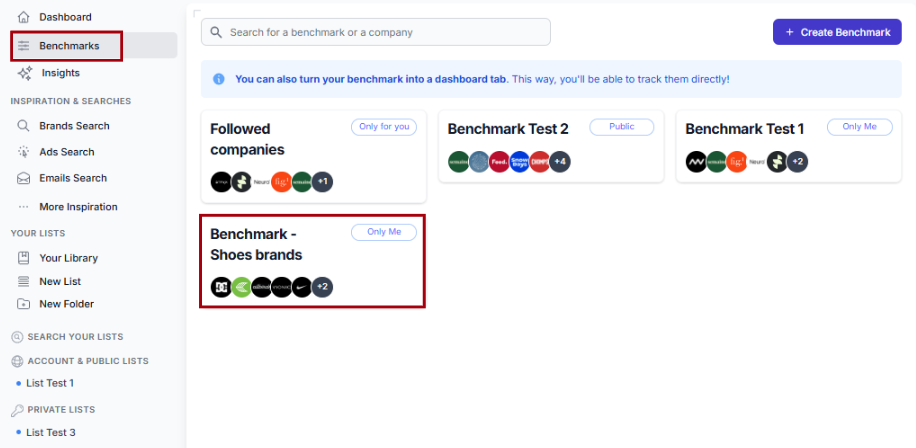 Each benchmark you create generates its own dedicated dashboard on the home page, under the same name.
